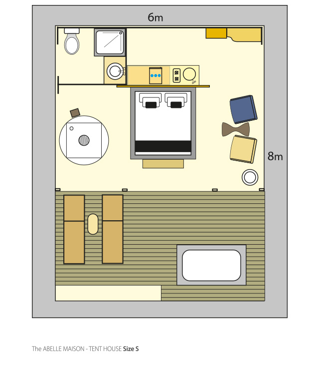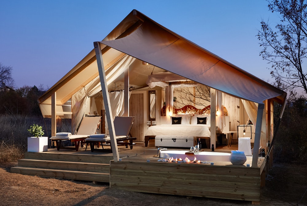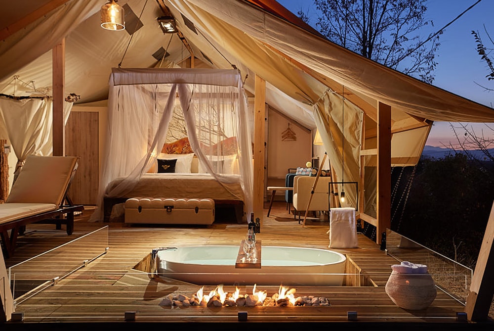Equipped with stylish furniture, a designer en suite shower, the tent house includes a lavish outdoor bathtub on the deck, constructed with practical finishing materials and a luxurious décor.